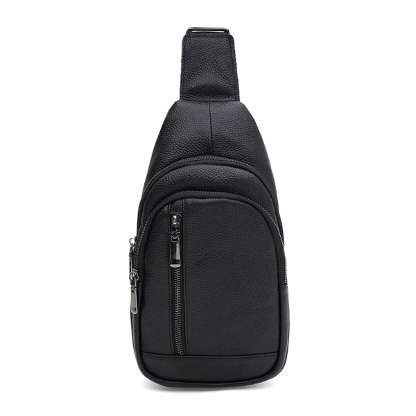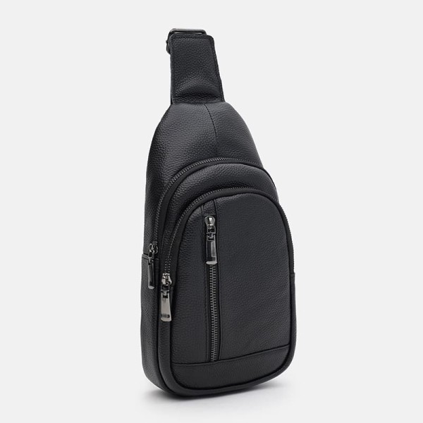 Мужской кожаный рюкзак имеет 1 основное отделение на молнии. Внутри 1 карман на молнии. С лицевой стоороны-2 кармана на молнии. Подкладка текстиль. Несъемный текстильный ремень регулируется по длине.