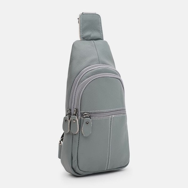 Женский кожаный рюкзак имеет 1 отделение на молнии. С лицевой стороны -2 кармана на молнии, с тыльной стороны-1 карман на молнии. Подкладка текстиль. Несъемный текстильный ремень регулируется по длине.