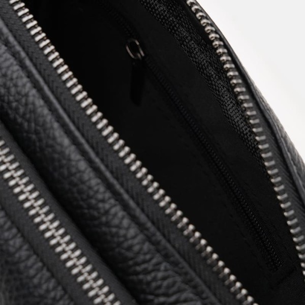 Мужская сумка выполнена из натуральной кожи, закрывается на молнию. Имеет 2 основных отделения, внутри сумки имеется 1 карман на молнии. С лицевой стороны- 2 кармана на молнии, с тыльной-1 карман на молнии. Подкладка текстиль. В комплекте несъёмный ремень: кожа + текстиль.