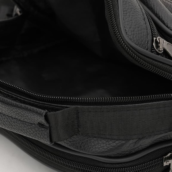 Мужская кожаная сумка имеет 2 основных отделения. С лицевой стороны - 3 кармана на молнии, с тыльной -1 карман на молнии. Подкладка текстиль. Ручка: кожа + текстиль; несъемный текстильный ремень регулируется по длине.