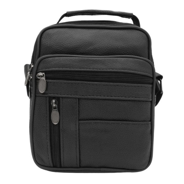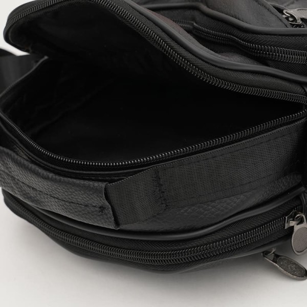 Мужская кожаная сумка имеет 2 основных отделения. С лицевой стороны - 4 кармана на молнии, с тыльной -1 карман на молнии. Подкладка текстиль. Ручка: кожа + текстиль; несъемный текстильный ремень регулируется по длине.