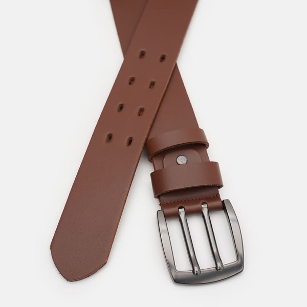 Мужской кожаный ремень. Качественные материалы, стильная пряжка и аккуратный внешний вид. Ремень выполнен из натуральной кожи и металлической фурнитуры. Лицевая сторона ремня защищена от влаги, жира и агрессивных сред. Уход – минимальный (сухая чистка). При необходимости, ремень можно укоротить самостоятельно до нужной вам длины.